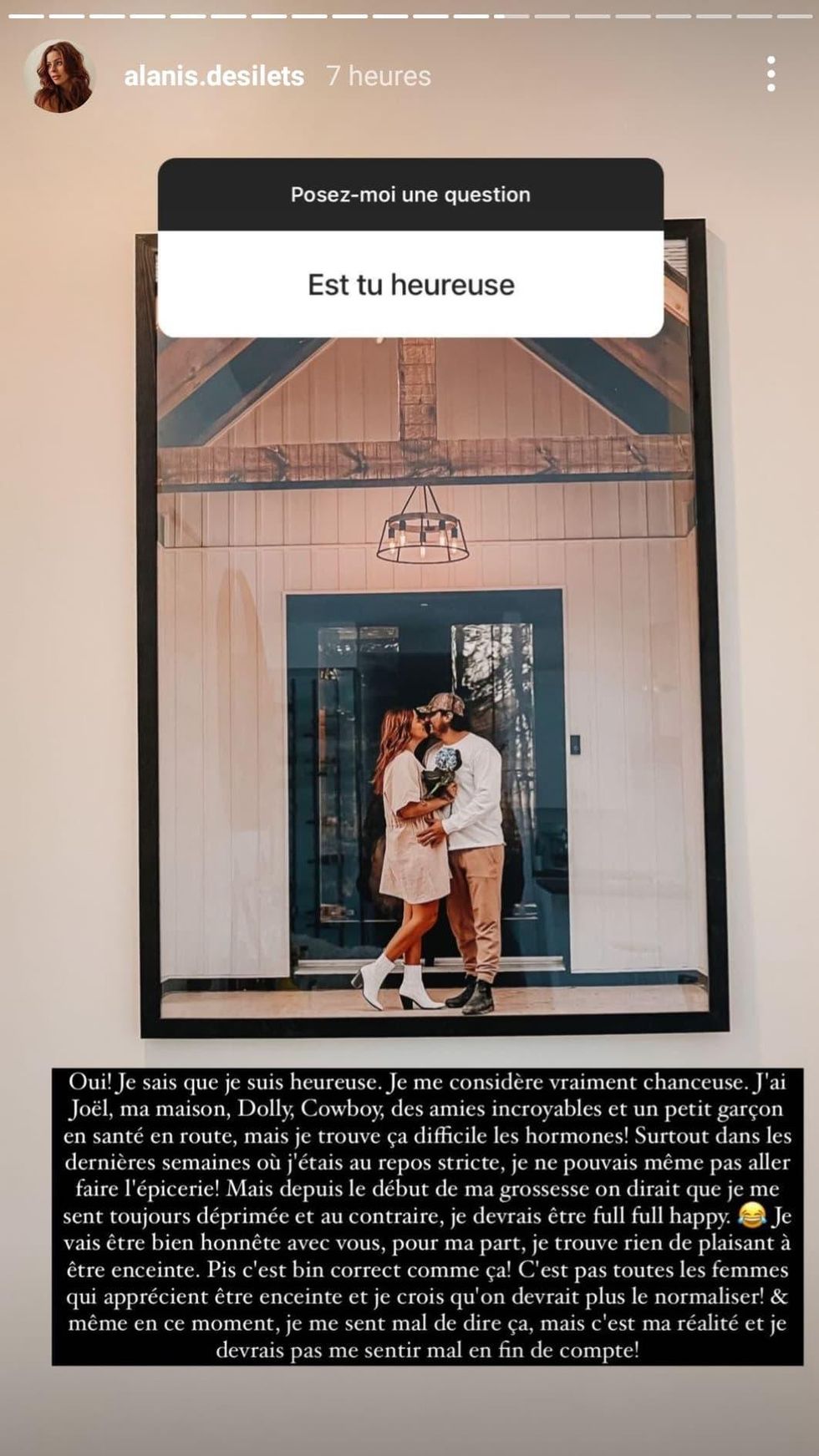 C'est lorsqu'un.e abonné.e lui a demandé si elle était heureuse qu'Alanis a expliqué qu'elle se considère chanceuse d'avoir sa petite famille, avec son fiancé Joël Giguère, ses chiens, leur petit garçon en route ainsi que leur maison.