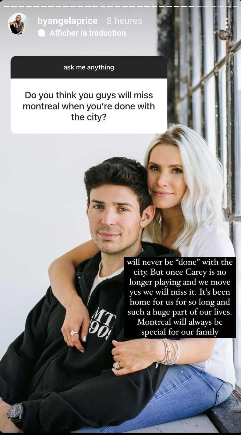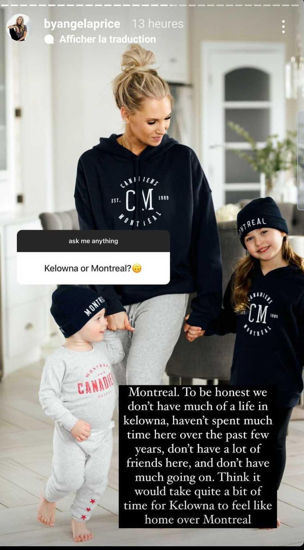 Et si Angela appelle cette demeure leur « forever home », la femme du hockeyeur s'est confiée, dans une série de questions-réponses sur Instagram, à propos de leur vie de famille dans l'Ouest versus celle à Montréal. Il semblerait qu'il n'y ait aucun doute que la métropole québécoise reste l'endroit où elle se sent le plus à la maison.