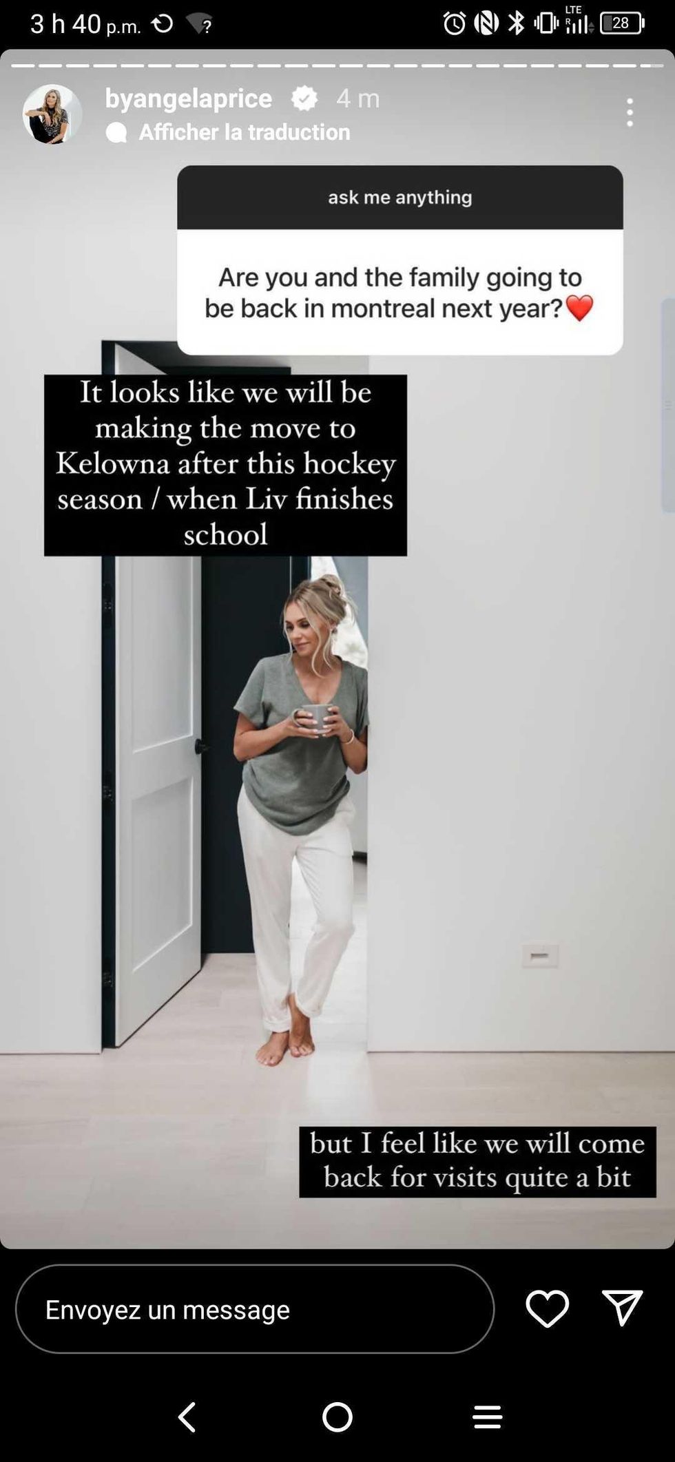 Devant cette situation, un déménagement sera bientôt en branle pour les Price. Angela, épouse du hockeyeur, a d'ailleurs abordé le sujet lors d'une séance de questions-réponses sur sa page Instagram ce 29 janvier 2023.