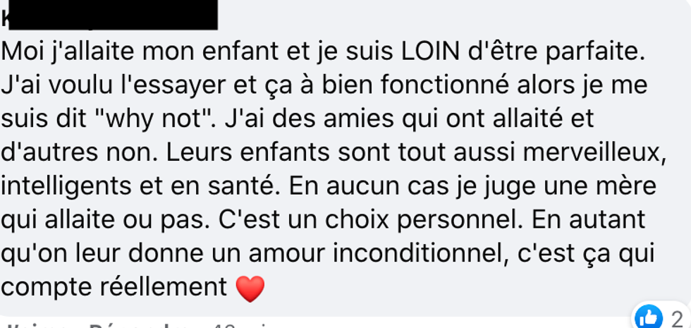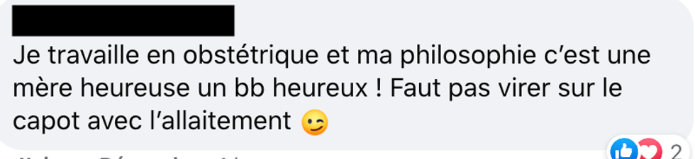 « PS Jamais je ne juge une mère qui allaite. C'pas de mes affaires. Tu peux l'allaiter jusqu'à ses 12 ans c'pas de mes affaires. TON ENFANT, TES BOULES, TON CHOIX. »