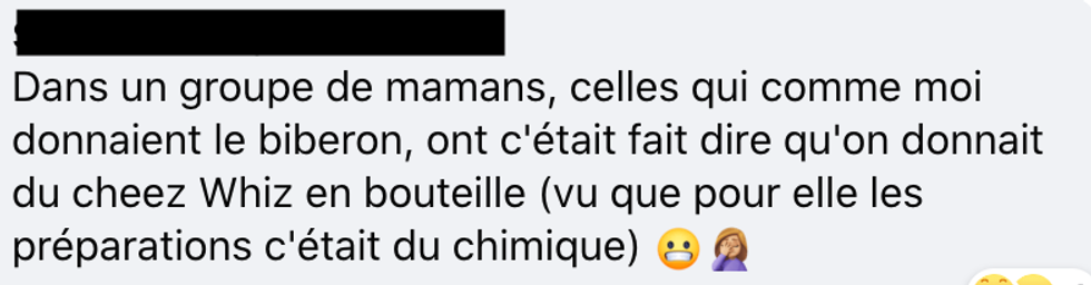 « En 2021 on n'est pas obligé d'allaiter ni de se cacher pour donner le biberon. La culpabilité et la pression que les professionnels de la santé, les chums, la famille et la société exercent sur les mères : c'est NON. Mon enfant, mes boules, mon choix. Amen. »