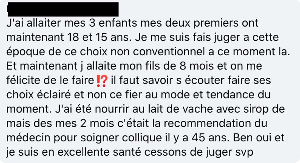 L'un des commentaires souligne même à quel point le débat est changeant et persécutant, alors que l'allaitement était aussi jugé à certaines époques. Bianca termine d'ailleurs son message sur ces mots sur l'allaitement :