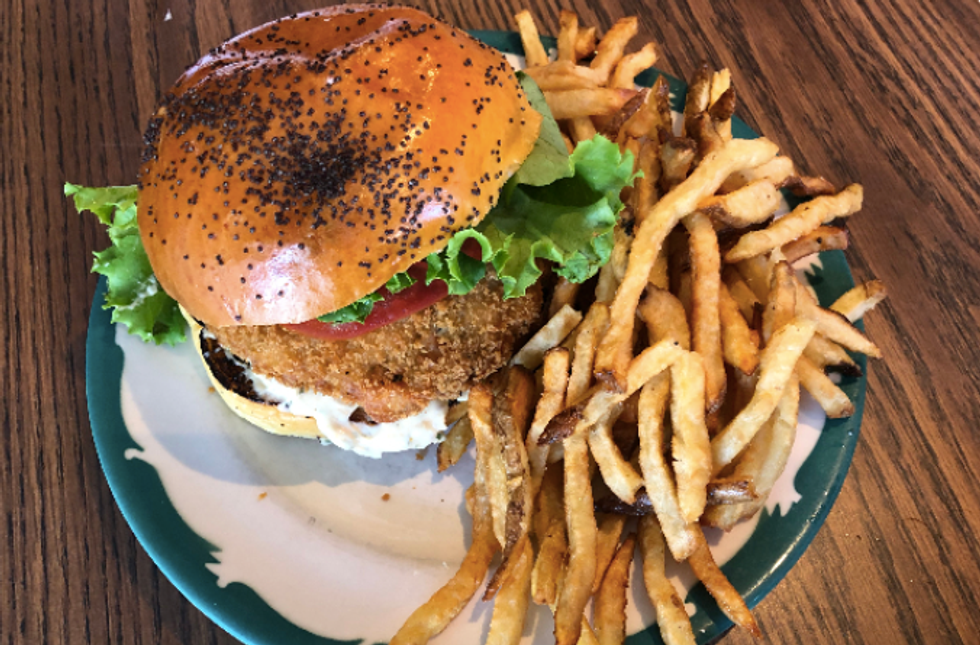 Pourquoi tu dois y aller : Si tu es amateur ou amatrice de fruits de mer, voilà ta chance de goûter au seul burger du concours qui a recours aux cadeaux de l'océan. On a ici une boulette de flétan et de turbot, servie sur pain brioché au pavot et garnie de fromage Cheddar orange et de sauce tartare, laitue, oignons et tomates.