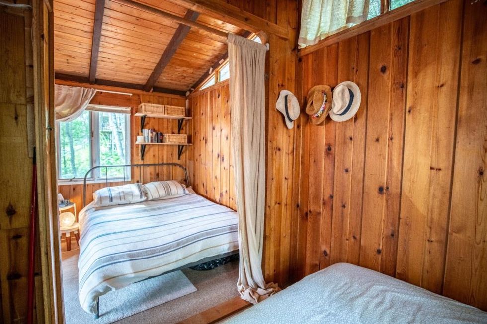 À l'intérieur, le chalet comprend deux chambres, une salle de bain et détient même une douche extérieure qui est parfaite après une baignade dans le lac. Juste au milieu du salon, il y a un petit four à bois qui est idéal pour un petit feu avec ta moitié à la fin de la journée.