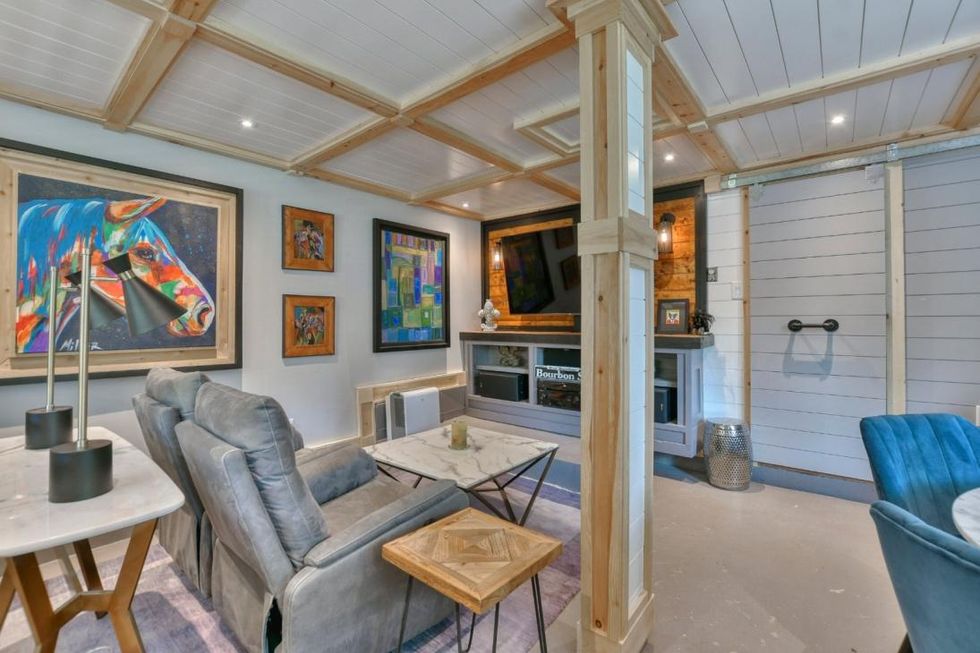 Dans la maison, il y a un sous-sol qui a été reconverti en cinéma maison qui donne sur un solarium très accueillant.