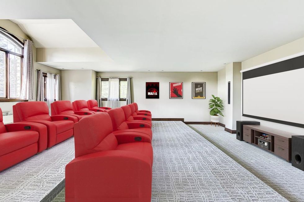 Parmi la vingtaine de pièces, il y a trois chambres à coucher, quatre salles de bain, un cinéma maison, une cave à vin, un gym, deux salles de jeux et une bibliothèque.