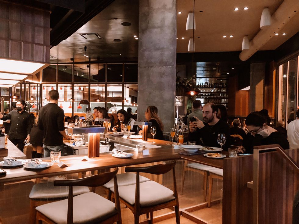 Tout est pensé avec précision pour créer la meilleure ambiance possible : plusieurs banquettes pour manger confortablement entre ami.es, de grandes tables, un énorme bar au milieu de l'espace sur lequel différents spiritueux sont posés.