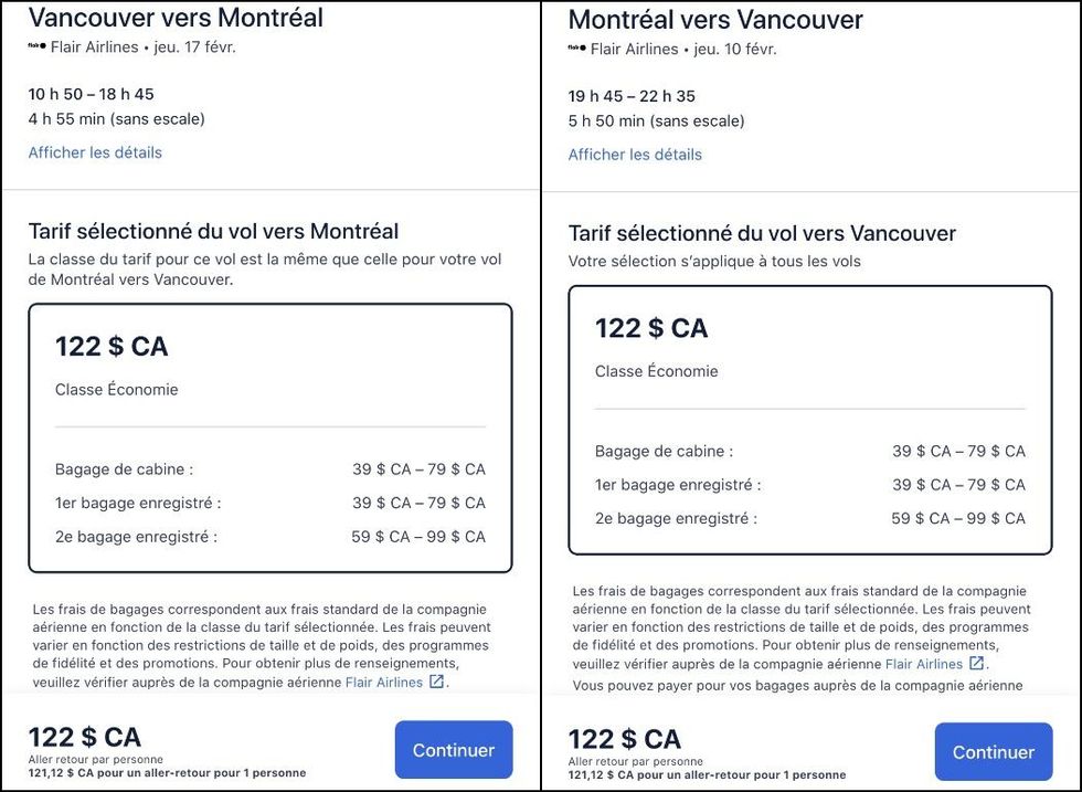 Le vol de Montréal à Vancouver marque son départ à 19 h 45 pour un total de près de six heures et le retour se fait à 10 h 50 de Vancouver pour une durée d'environ cinq heures, les deux étant sans escale.