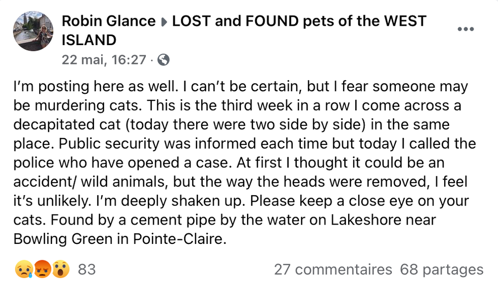 « Je ne peux pas en être sûr, mais je crains que quelqu'un tue des chats. C'est la troisième semaine consécutive que je tombe sur un chat décapité (aujourd'hui [ce 22 mai] il y en avait deux côte à côte) au même endroit », s'est exprimé Robin Glance, dans une publication Facebook sur le groupe Lost and Found pets of the West Island.