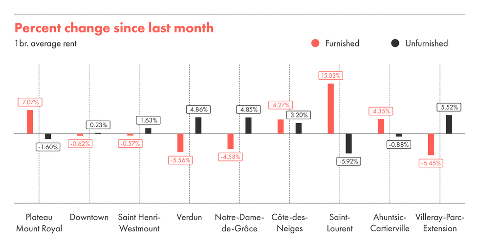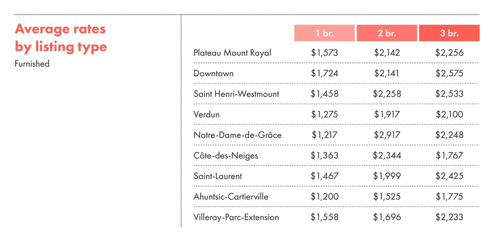 La tendance reste la même pour les appartements meublés. Le centre-ville reste le plus cher à louer suivi du Plateau-Mont-Royal, tandis que Ahunstic-Cartierville est la place la plus abordable.