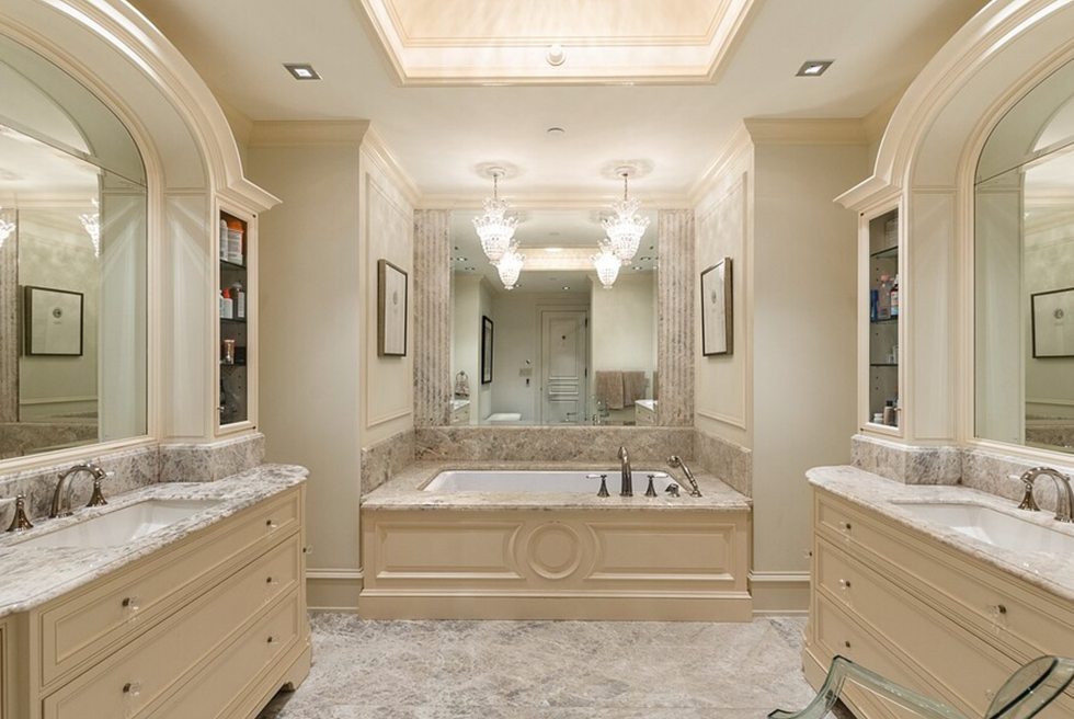 Voilà une salle de bain royale. En faisant l'acquisition de cette somptueuse propriété, tu pourrais te prélasser dans cette magnifique baignoire en dessous des chandeliers.