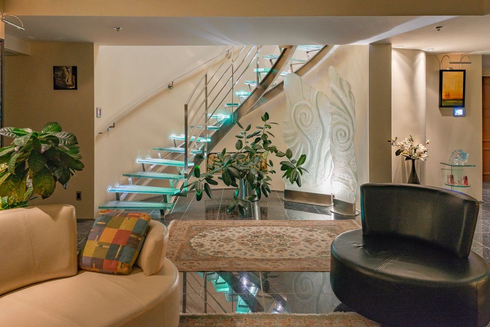 Un escalier illuminé en verre permet de passer de l'intérieur à la terrasse privée sur le toit.