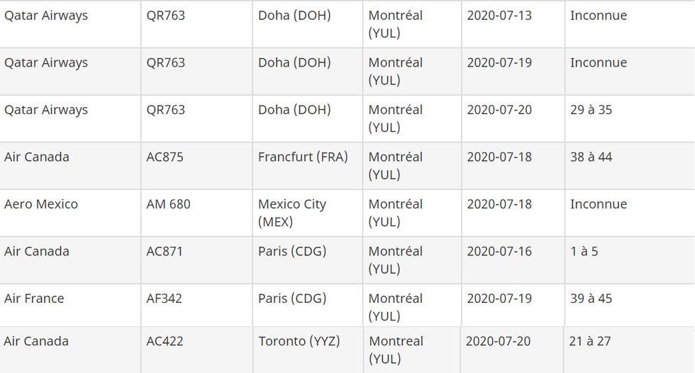 Ce sont huit vols domestiques et internationaux avec des cas confirmés de COVID-19 qui ont atterri en sol montréalais les 13, 16, 18, 19 et 20 juillet 2020.