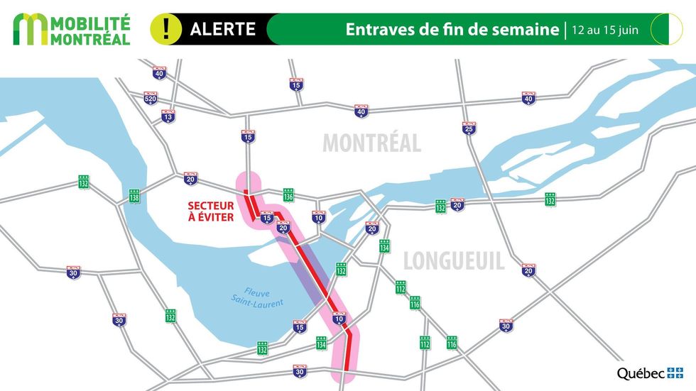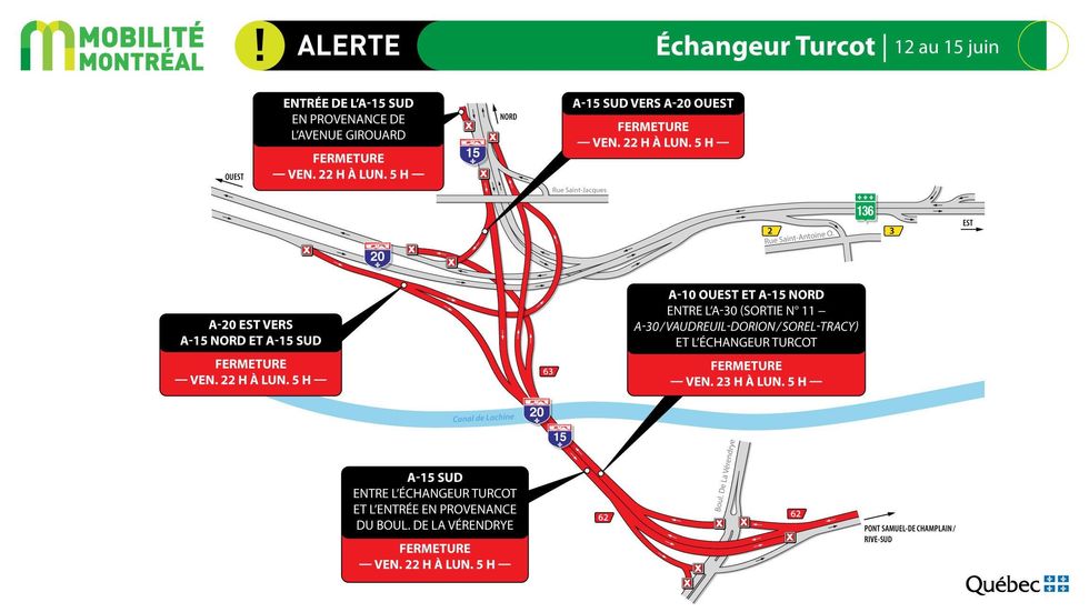 Des entraves importantes nuiront donc à la circulation, « notamment dans le corridor de l'A-10 Ouest et de l'A-15 Nord, entre l'A-30 et l'échangeur Turcot », selon ce qu'on apprend dans un communiqué publié le 8 juin dernier. Le pont Samuel-De Champlain sera également impacté.