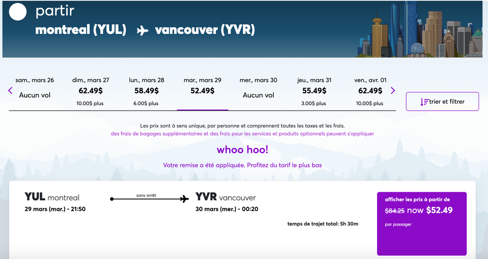 Dans le simulateur de voyage de la compagnie aérienne, il y a un vol aller simple vers Vancouver pour 52,49 $ le 29 mars et un billet retour le lundi 4 avril à 47,07 $, ce qui fait un aller-retour pour moins de 100 $. Rappelons que plusieurs dates de retour sont possibles au même prix.