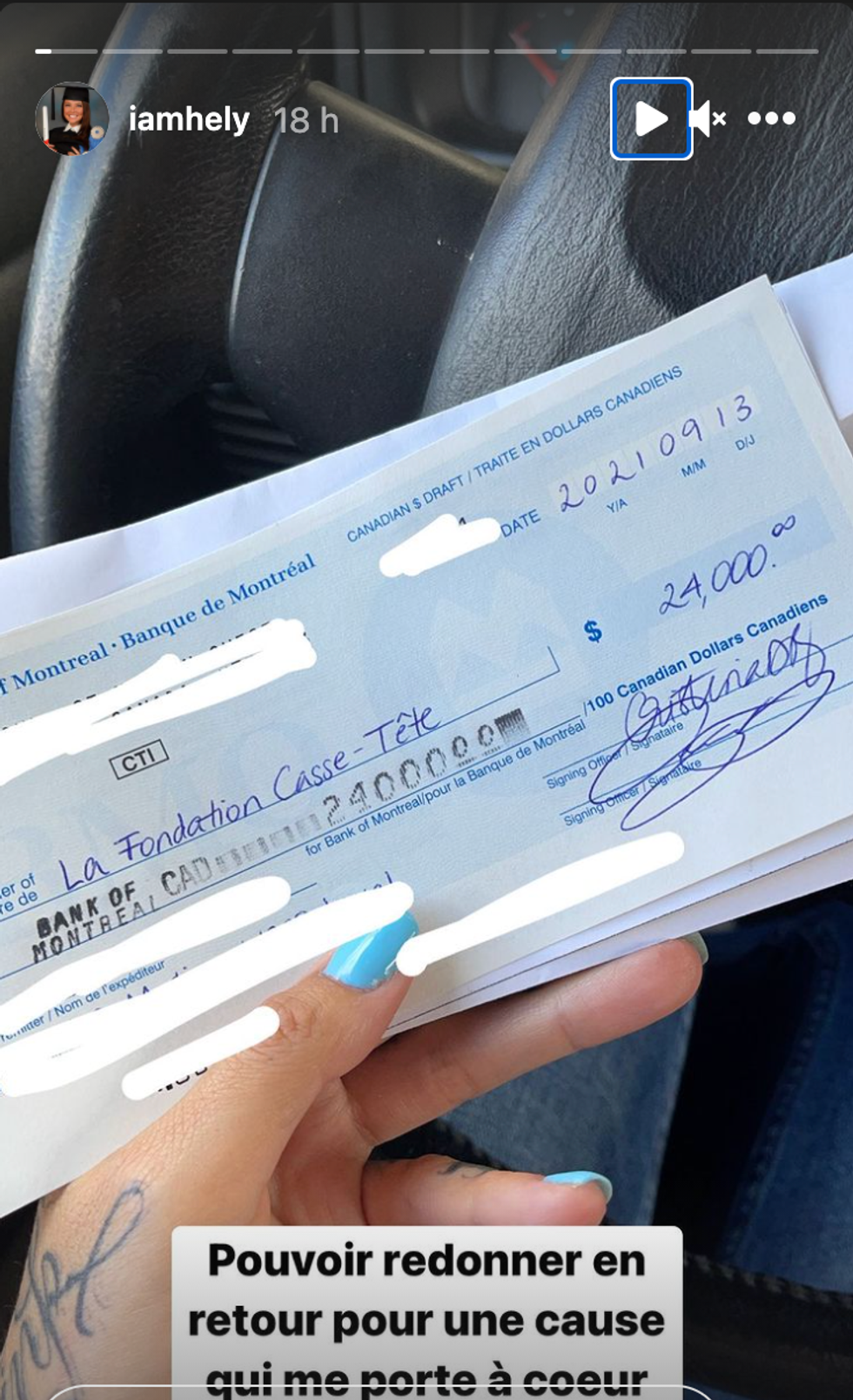 Alors que la jeune femme a partagé la photo d'un chèque émis à l'ordre de la Fondation Casse-Tête sur Instagram, plusieurs personnes lui auraient demandé quelle était cette fondation à qui elle remettait un chèque de 24 000 $.