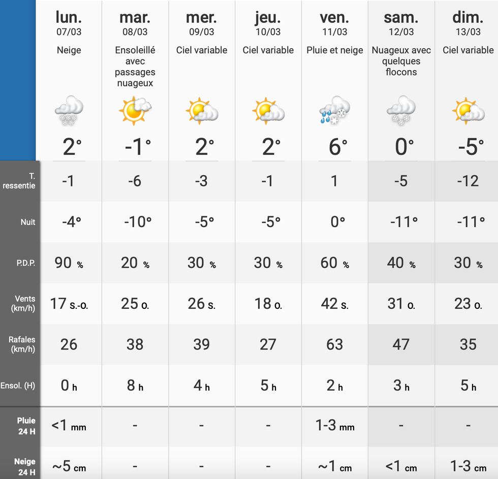 D'autres épisodes neigeux sont prévus en fin de semaine, mais tu devras t'attendre à des quantités moindres que lorsqu'il y a des tempêtes hivernales. Un maximum de trois centimètres de neige est attendu par jour ce vendredi 11 et ce samedi 12 mars.