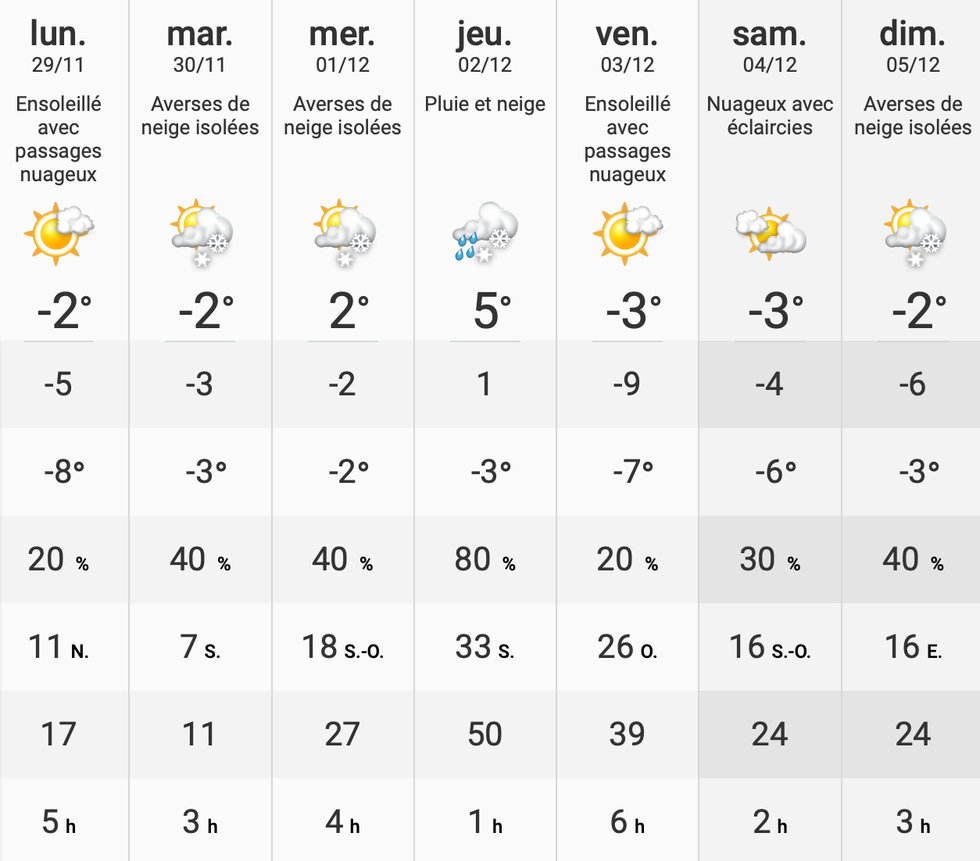 Côté mercure, ce sera la journée de jeudi qui sera la plus chaude avec un ressenti de 1 degré. Tous les autres jours de la semaine, il fera des températures ressenties en dessous du point de congélation (zéro degré) qui oscilleront entre -5 et -9.