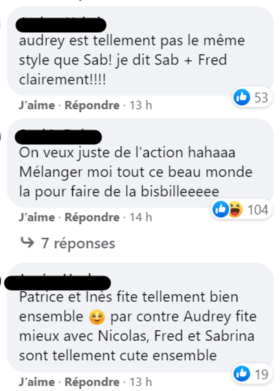 Pour ce qui est de Sabrina, Frédérick, Audrey et Nicolas, ce sont les couples déjà formés qui gagnent le plus de points auprès du public. S'il fallait que de gros changements arrivent, ça risque de beaucoup faire réagir.