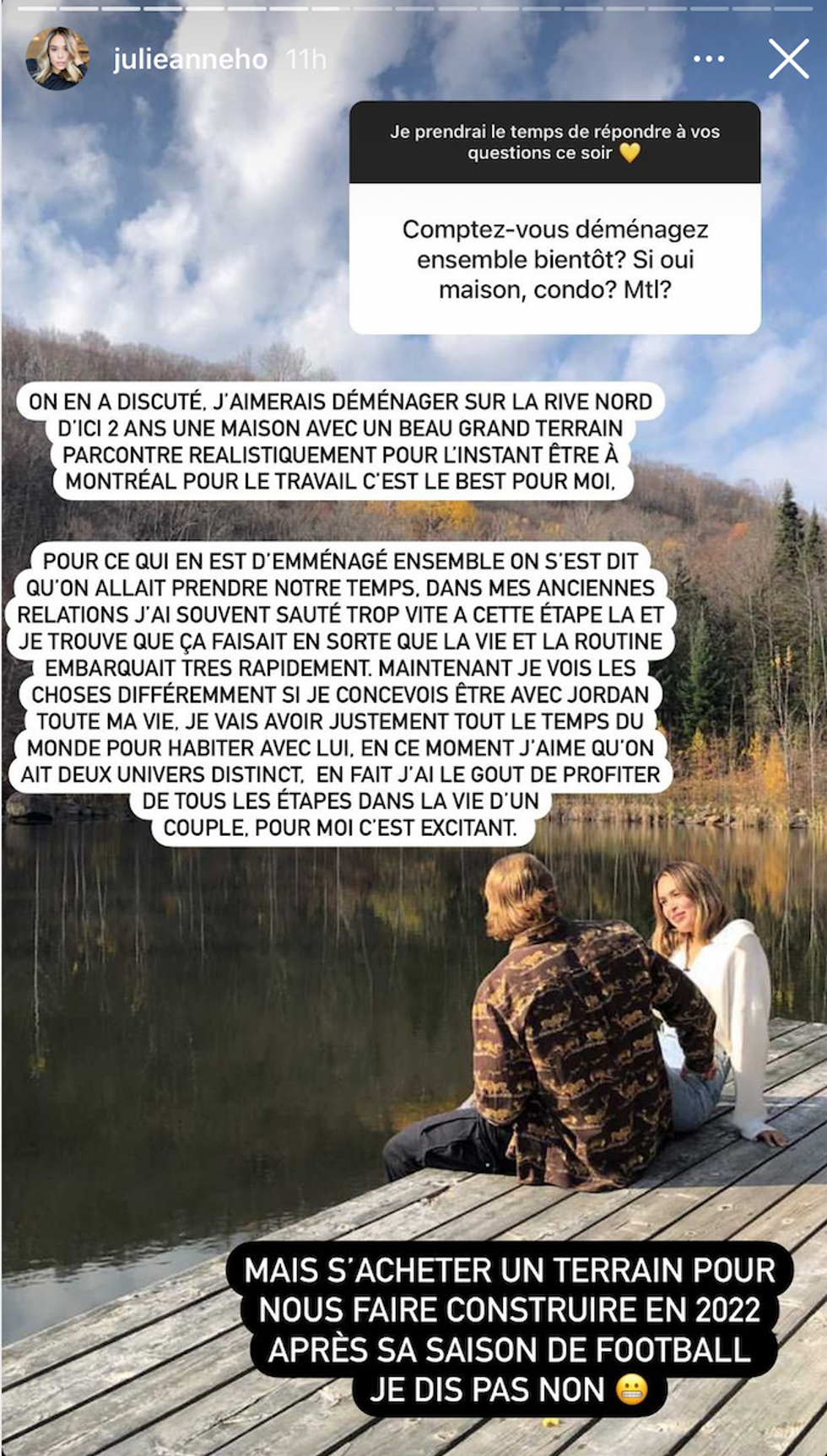 Julie-Anne s'est penchée sur la possibilité de déménager avec son amoureux suite à l'interrogation d'un ou d'une abonnée lors d'une série de questions/réponses en stories Instagram, le mercredi 28 avril.