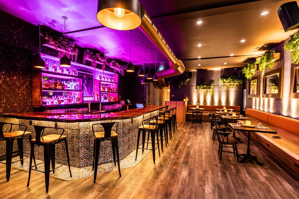 D'un côté tu retrouveras le bar vêtu de céramique bleue et blanche pour un air plus décontracté et de l'autre, tu verras des inspirations du Mexique avec de la verdure et des teintes neutres.