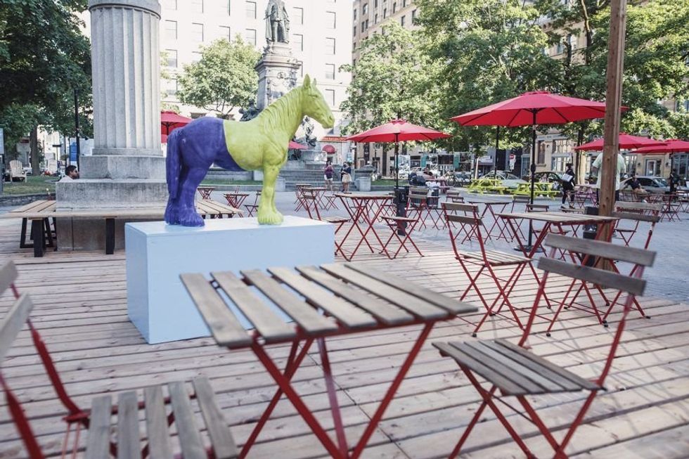 C'est le Time Out Market Montréal qui a décidé d'aménager une terrasse à même le square Phillips, à l'angle des rues Union et Ste-Catherine.