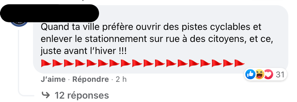 « Quand ta ville préfère ouvrir des pistes cyclables et enlever le stationnement sur rue à des citoyens, et ce, juste avant l'hiver!! 🚩🚩🚩🚩🚩🚩🚩🚩🚩🚩🚩🚩🚩🚩🚩🚩», a ajouté ce Québécois.