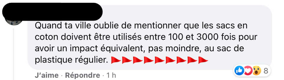 « Quand ta ville oublie de mentionner que les sacs en coton doivent être utilisés entre 100 et 3 000 fois pour avoir un impact équivalent, pas moindre, au sac de plastique régulier 🚩🚩🚩🚩🚩», a indiqué cette Québécoise.