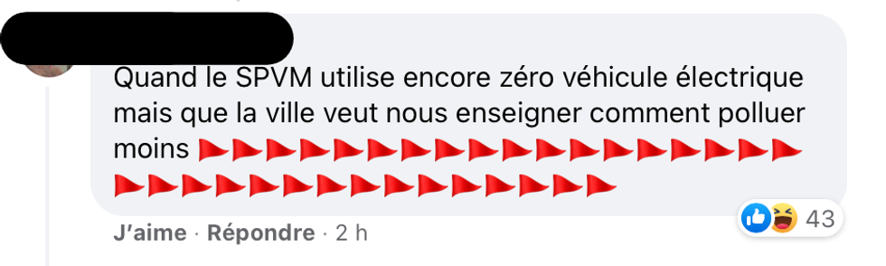 « Quand le SPVM utilise encore zéro véhicule électrique mais que la ville veut nous enseigner comment polluer moins 🚩🚩🚩🚩🚩🚩🚩🚩🚩🚩🚩🚩🚩🚩🚩🚩🚩🚩🚩🚩🚩🚩🚩🚩🚩🚩🚩🚩🚩🚩🚩🚩🚩», a répondu cet internaute.