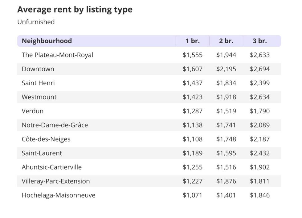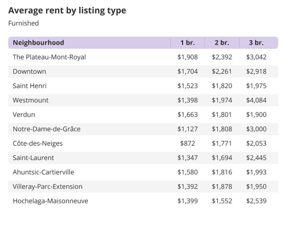 Le rapport, qui cumule les données des sites Internet d'annonces immobilières, examine le prix moyen de onze quartiers populaires à Montréal : le Centre-ville, le Plateau-Mont-Royal, Côte-des-Neiges, Notre-Dame-de-Grâce, Saint-Laurent, Hochelaga-Maisonneuve, Villeray-Parc-Extension, Ahuntsic-Cartierville, Saint-Henri, Verdun et Westmount. Tu y verras les taux moyens des annonces de location pour les appartements meublés et non meublés pour le mois de janvier 2022.