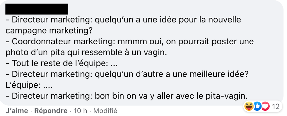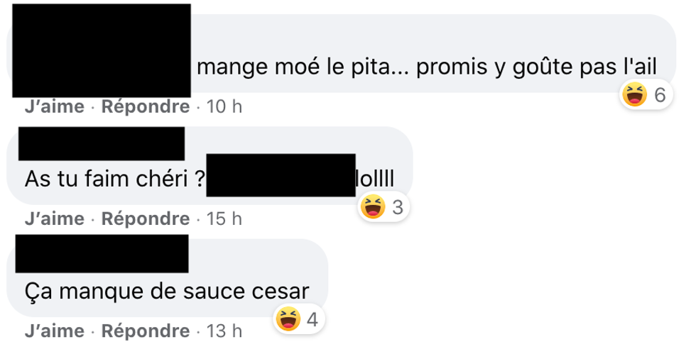 D'un autre côté, des blagues à connotations sexuelles comme « mange mon pita » ou « il manque la sauce » se multiplient sous l'image par celleux qui y perçoivent de l'humour.