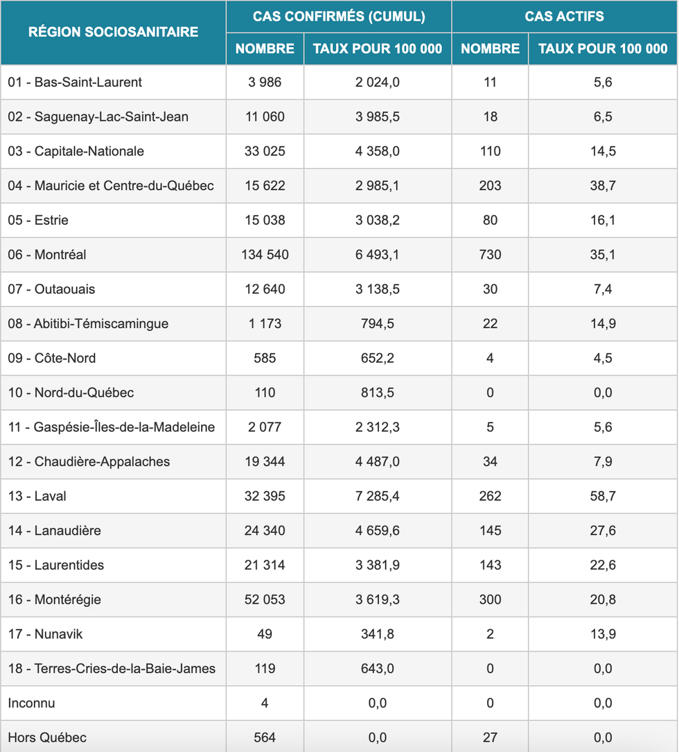 L'Outaouais, Chaudière-Appalaches, la Gaspésie–Îles-de-la-Madeleine, la Côte-Nord, le Saguenay–Lac-Saint-Jean et le Bas-Saint-Laurent présentent des chiffres encourageants avec un taux en deçà de 10 cas positifs pour 100 000 personnes.