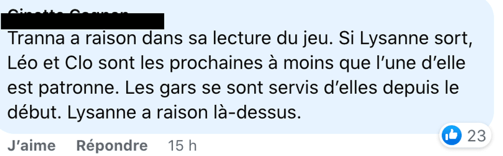 « Les gars se sont servis d'elles depuis le début. Lysanne a raison là-dessus. », dit un.e internaute en commentaire sur le Facebook officiel de l'émission.