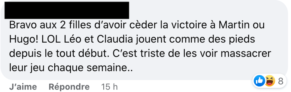 « Change my mind : Si le plan de Claudia et Léo est, en effet, de cibler Martin cette semaine... leur décision de sacrifier Lysanne au profit de Steph devient COMPLÈTEMENT ridicule », affirme un.e autre téléspectateur.trice sur Twitter.