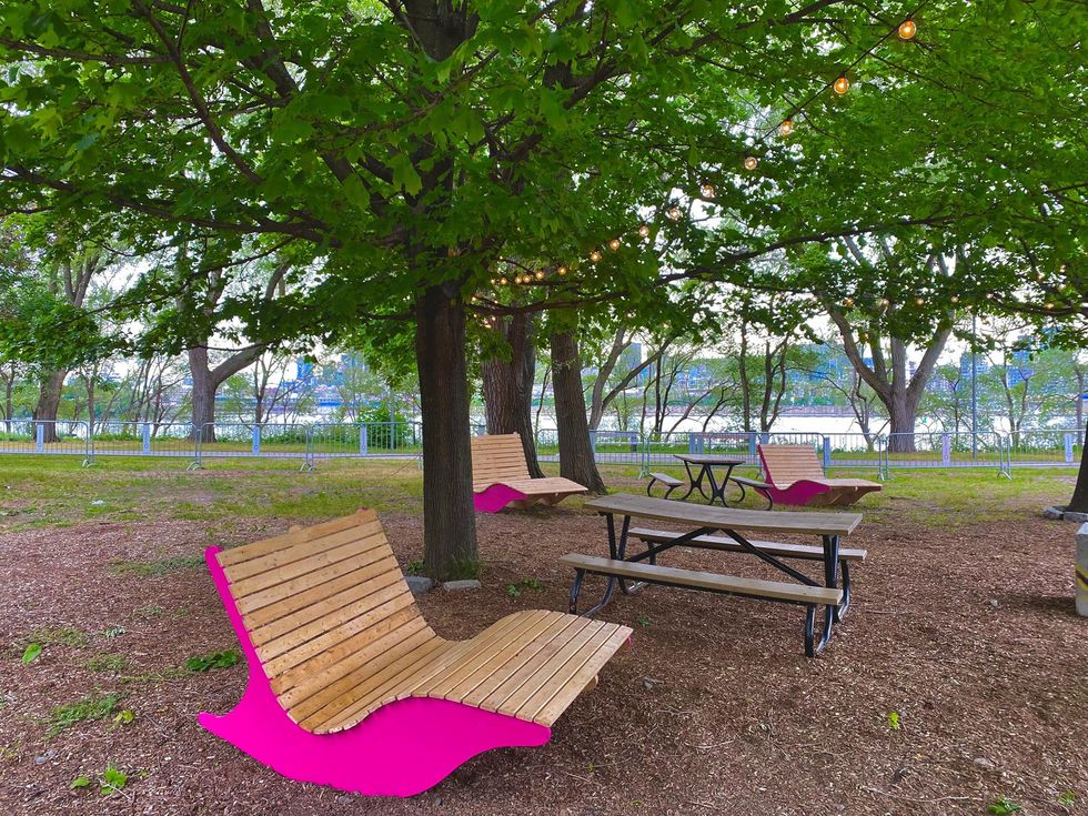 Tu peux également profiter de plusieurs aménagements extérieurs. Des tables de ping-pong, des terrains de pétanque, des balançoires éphémères ou encore des espaces dédiés aux pique-niques sont mis en place à proximité du fleuve et donnent une vue incroyable sur la skyline du centre-ville de Montréal.