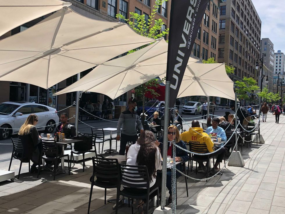 Voici de quoi l'achalandage avait l'air en fin d'avant-midi ce 28 mai sur les terrasses de la rue Sainte-Catherine, dans le centre-ville.