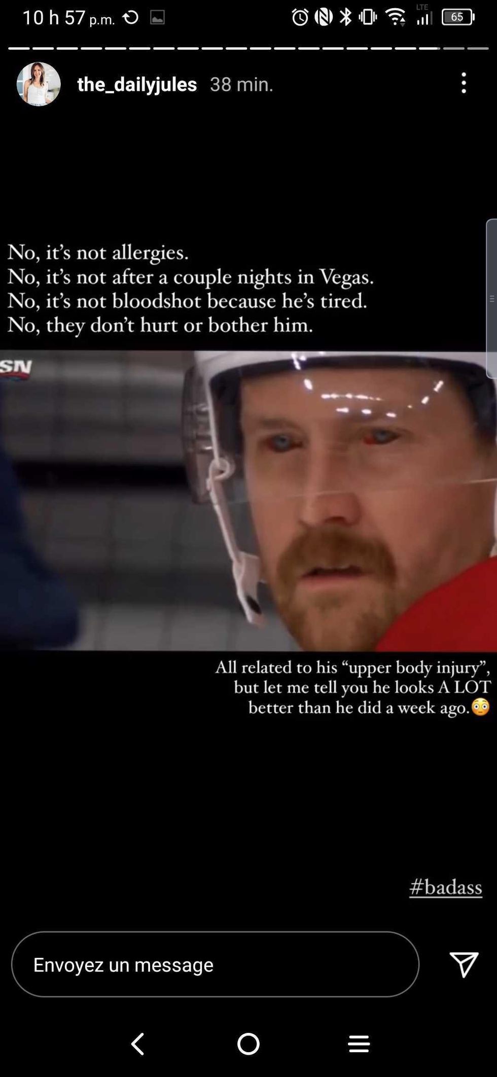 « Non, ce ne sont pas des allergies. Non, ce n'est pas à cause des quelques nuits à Vegas. Non, ce n'est pas parce qu'il est fatigué. Non, ils ne font pas mal et ne le dérangent pas », a-t-elle d'abord écrit avant d'expliquer que c'était relié à la blessure au haut du corps du joueur.