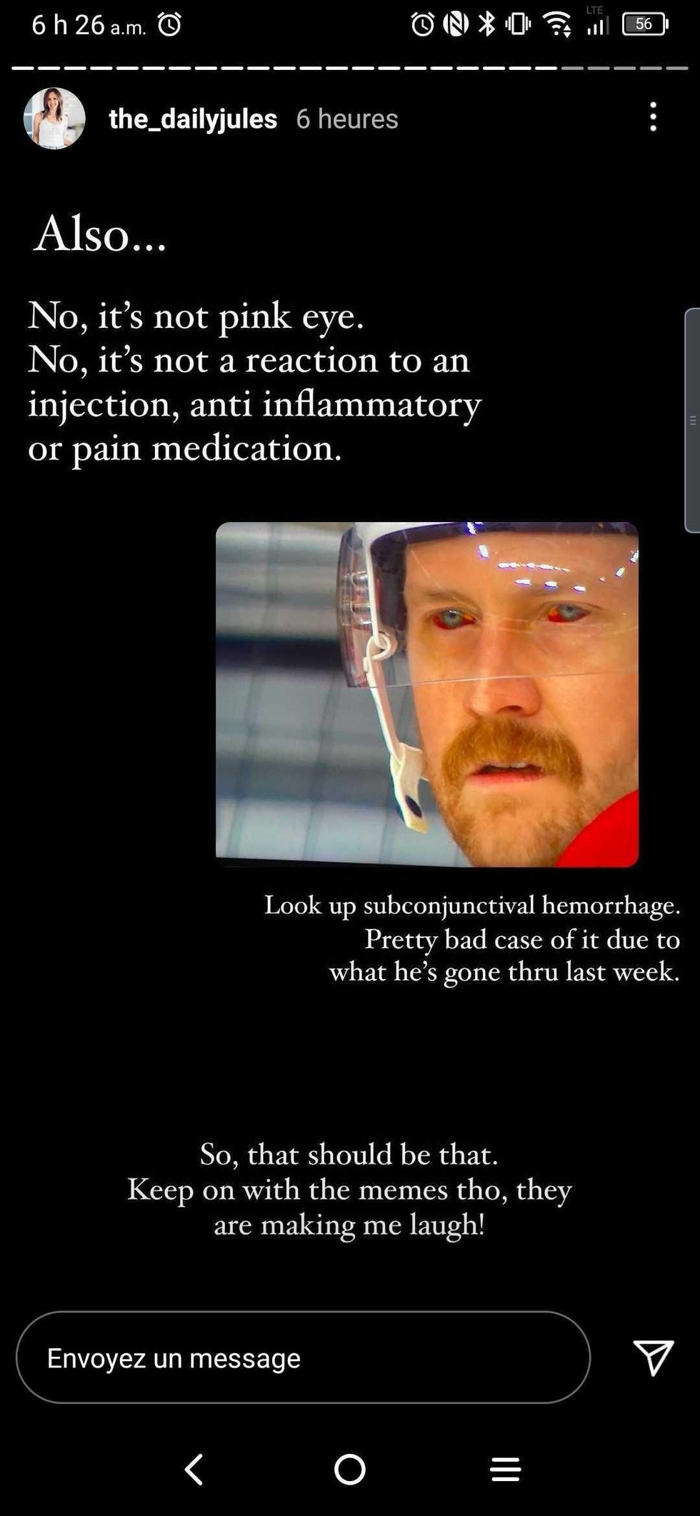 C'est plus tard en soirée que Julie Petry, la femme du numéro 26, a adressé la situation et a répondu à la question que tous.tes se demandaient : qu'est-ce qui se passe avec les yeux de Jeff?