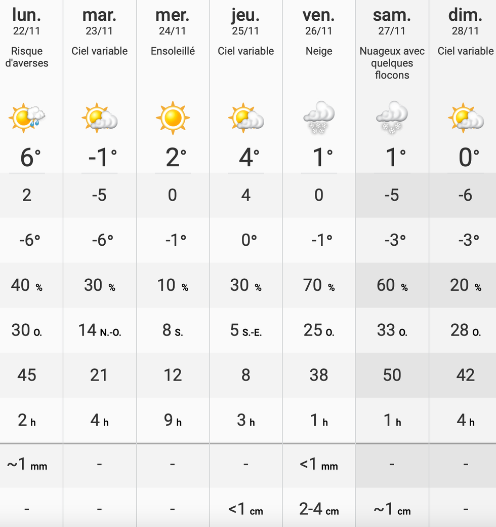 Cette semaine du 22 novembre, le mercure va osciller entre 6 et -1 degrés, mais c'est au niveau de la température ressentie que tu risques d'avoir un bon coup de froid : il fera entre 4 et -6 degrés. Les journées les plus chaudes seront lundi et mardi avec un ressenti respectif de 2 et 4 degrés.