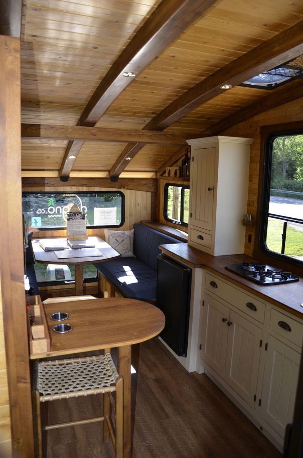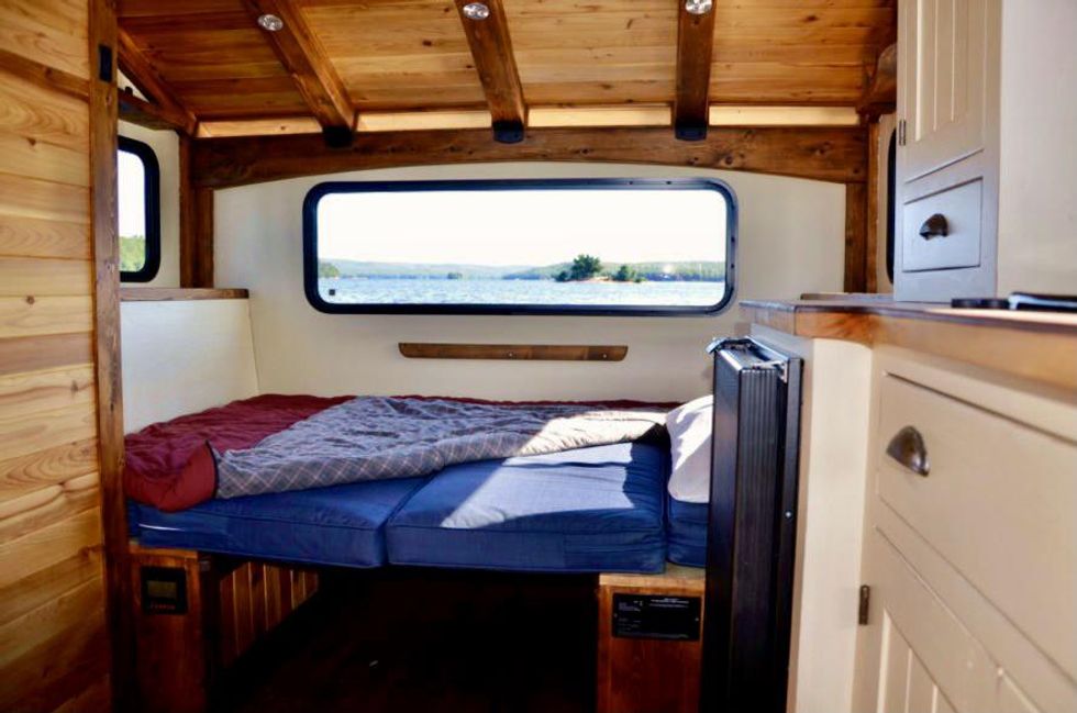 À l'intérieur du bateau, l'espace salon sert aussi de chambre à coucher avec un lit double.