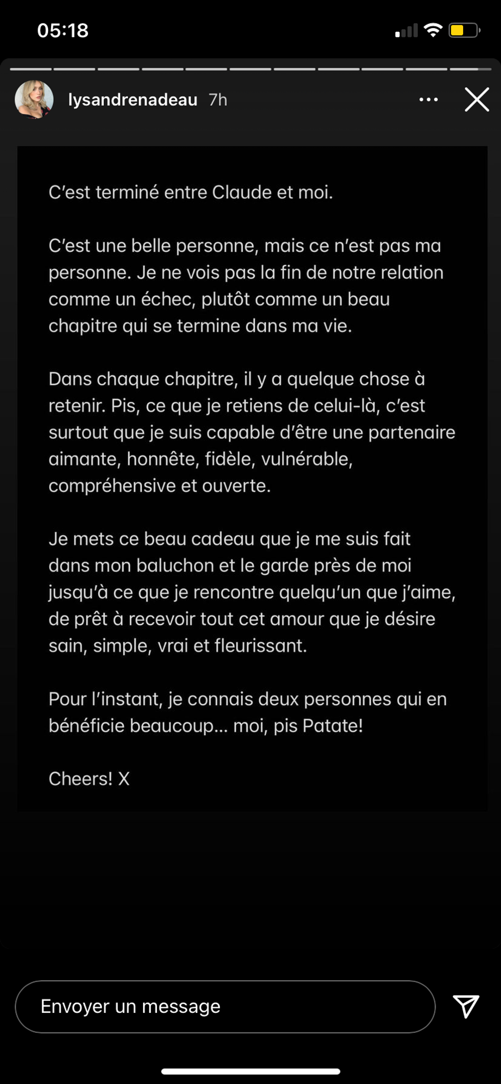 « C'est terminé entre Claude et moi. C'est une belle personne, mais ce n'est pas ma personne. Je ne vois pas la fin de notre relation comme un échec, plutôt comme un beau chapitre qui se termine dans ma vie. Dans chaque chapitre, il y a quelque chose à retenir. Pis, ce que je retiens de celui-là, c'est surtout que je suis capable d'être une partenaire aimante, honnête, fidèle, vulnérable, compréhensive et ouverte. »