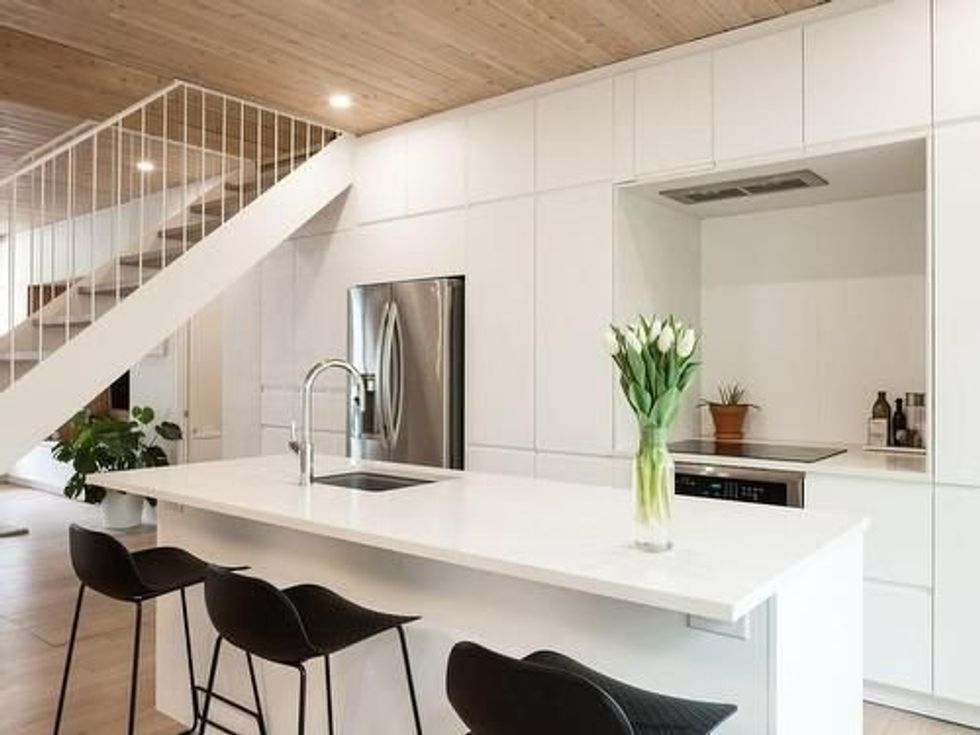 Le rez-de-chaussée à aire ouverte permet une luminosité impeccable durant le jour et les pièces sont équipées de modules de rangements qui passent inaperçus, pour un espace tout aussi magnifique que fonctionnel.