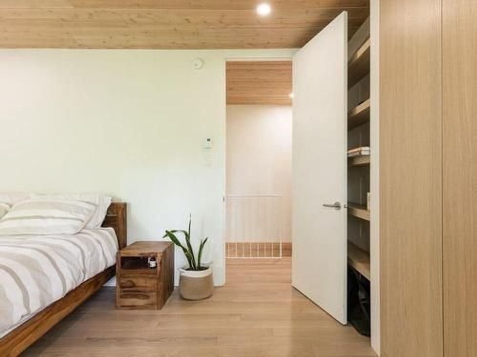 Dans la chambre des maîtres, on retrouve un balcon privé en cèdre et une armoire-penderie PAX.