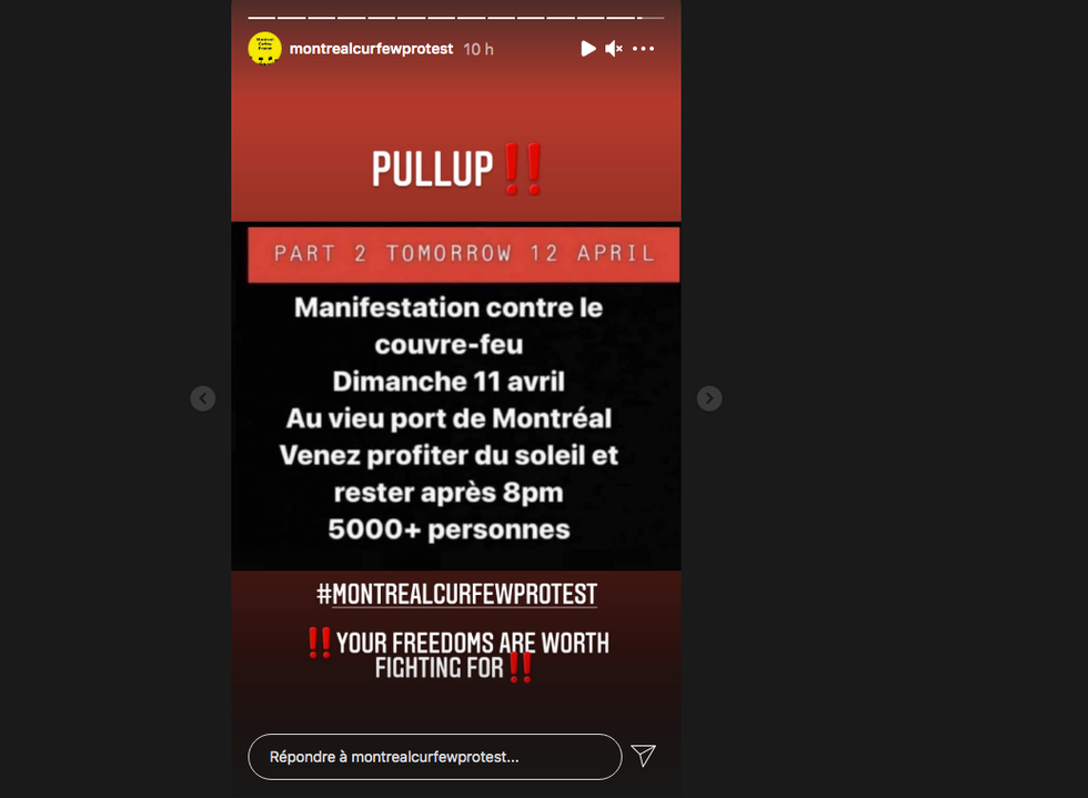 Selon les comptes Instagram montrealcurfewprotest et wsc.montreal, des rassemblements s'opposant aux mesures sanitaires s'organisent les soirs du 12 et 23 avril, ainsi que le 1er mai dans le Vieux-Port de Montréal.