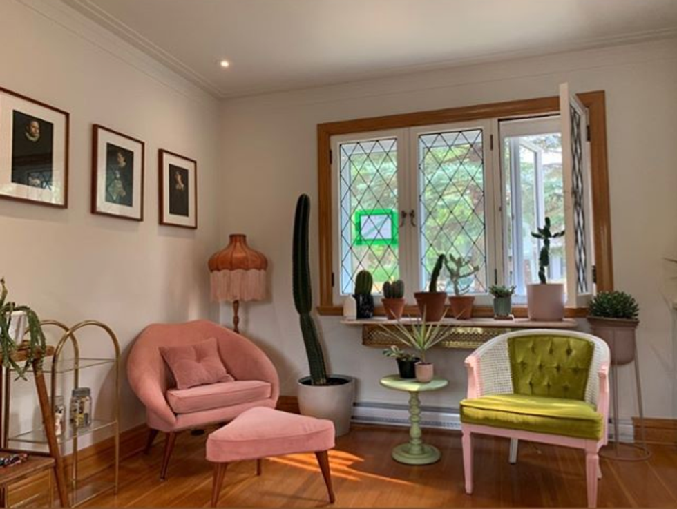 L'endroit est principalement blanc, avec des accents d'un vieux rose et de vert et beaucoup de plantes.