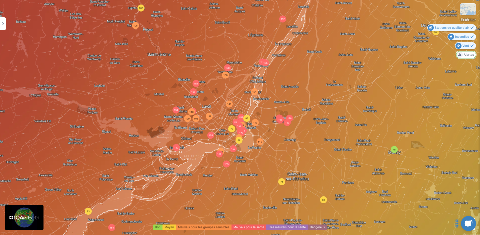 Mais dans certaines municipalités de la grande région métropolitaine, la situation était encore pire. Des endroits comme Saint-Bruno-de-Montarville et Repentigny affichaient respectivement des IQA de 178 et 175, des niveaux qualifiés également de « mauvais pour la santé », soit plus de 15 fois la valeur recommandée par l’Organisation mondiale de la Santé.