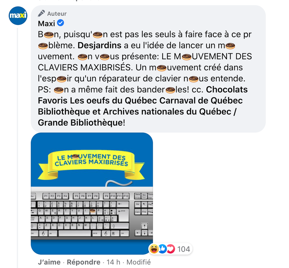 Dans la section des commentaires, le style d'écriture qui rappelle nos années de statuts créatifs sur MSN en a inspiré plusieurs autres. Dans les premiers messages, il y a Maxi qui a partagé une annonce afin de réparer les claviers « Maxibrisés » en interpellant d'autres entreprises à se joindre au mouvement.