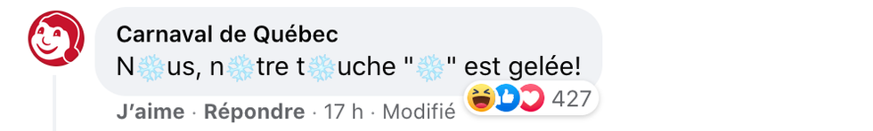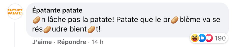 Il y a même le Carnaval de Québec qui a fait un jeu de mots avec un flocon de neige et Épatante patate qui a bien utilisé l'expression « On lâche pas la patate! »