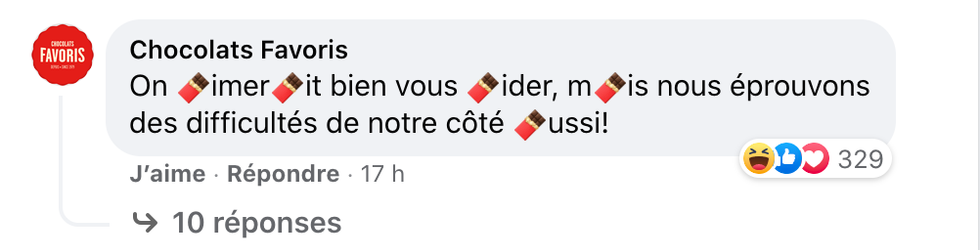 Certains d'entre eux ont répondu à l'appel en affirmant que le problème s'est répandu et en utilisant un émoji à leur image. Par exemple, Chocolats Favoris a remplacé la lettre « a » par une tablette de chocolat et Les oeufs du Québec ont changé les « o » par des petits oeufs.
