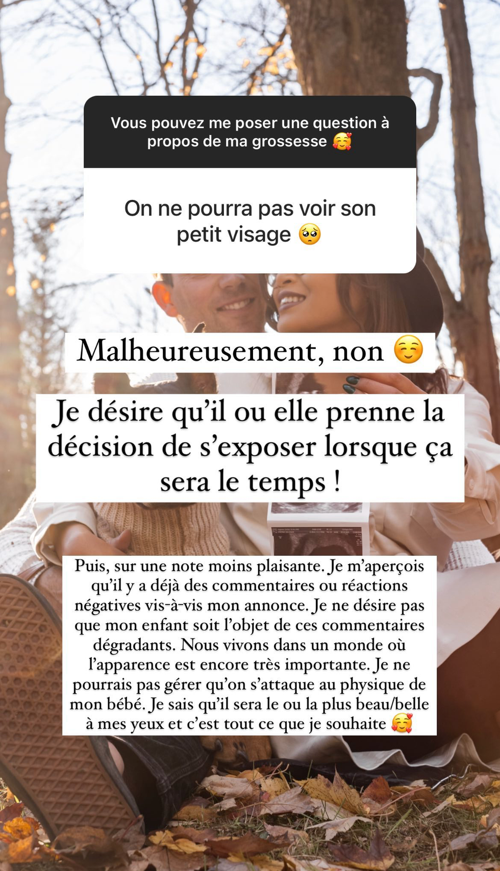 « Je m'aperçois qu'il y a déjà des commentaires ou réactions négatives vis-à-vis mon annonce. Je ne désire pas que mon enfant soit l'objet de ces commentaires dégradants, » ajoute-t-elle dans une seconde story sur le sujet.